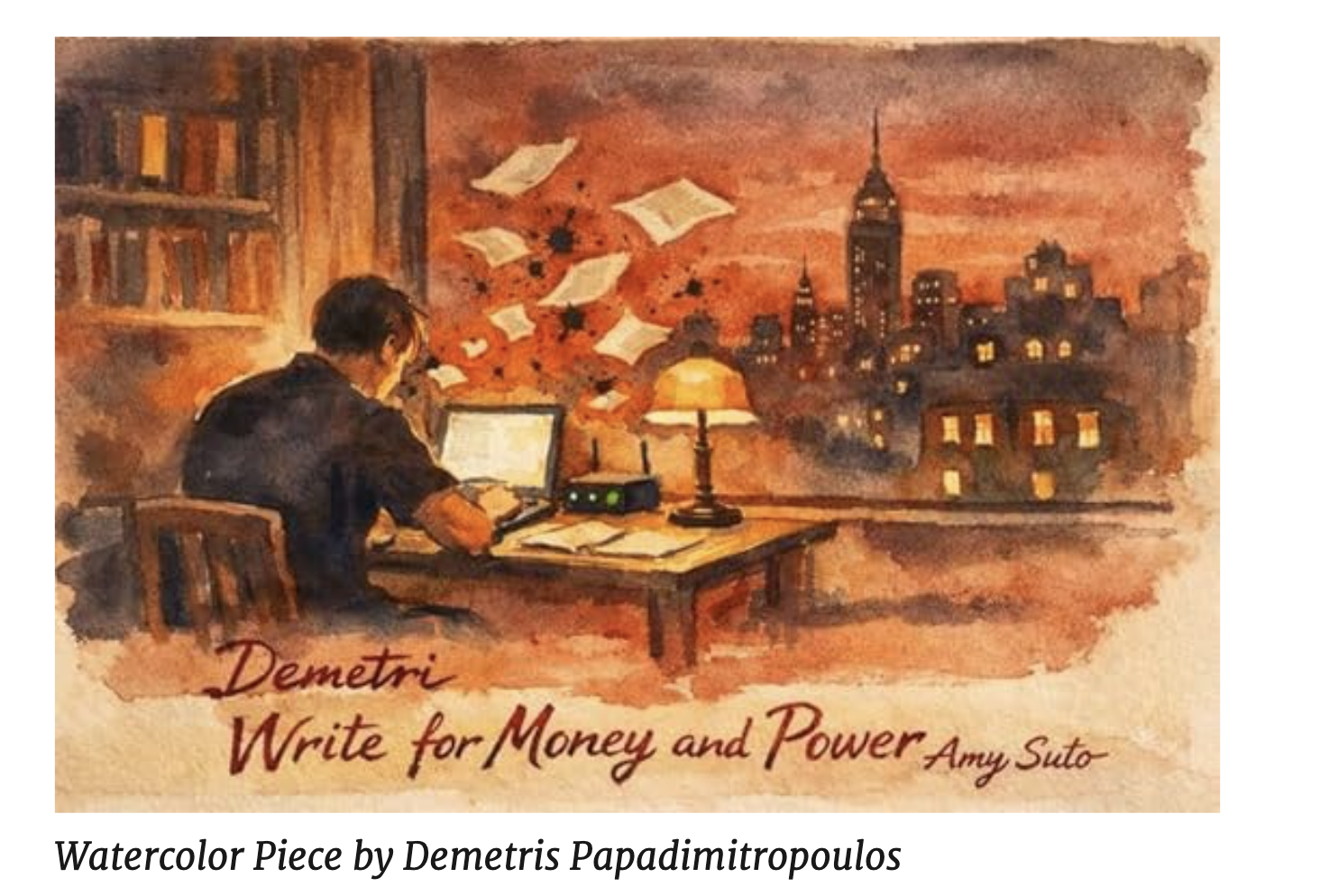 “In “Write for Money and Power,” Amy Suto arrives wearing two outfits at once: the silk robe of the artist and the tactical vest of the operator. She is here to romance you out of your shame about wanting money, then hand you a clipboard. She is here to seduce the starving artist myth into a dark alley and leave it there, blinking. She is here, most of all, to tell you that the modern writer’s problem is not talent. It’s architecture.” -Demetris Papadimitropoulos, book reviewer